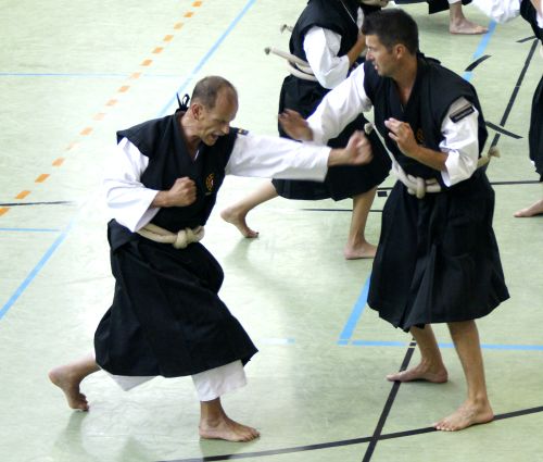 | Satoh-Sensei (8.Dan) zeigt dem Kammerl-Sensei (5.Dan) und allen anderen Teilnehmern die Juho-Technik “kiri-gote” |