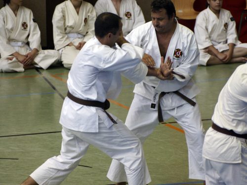 | Kammerl-Sensei (5.Dan) und Birling-Sensei (4.Dan) bei der Goho-Technik “shita-uke-keri”. |