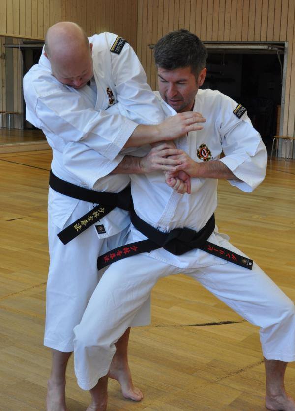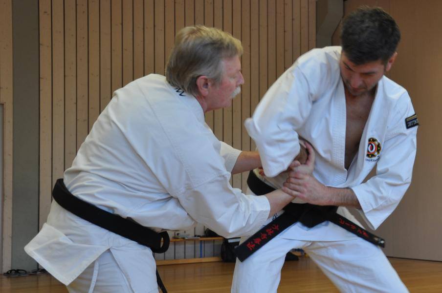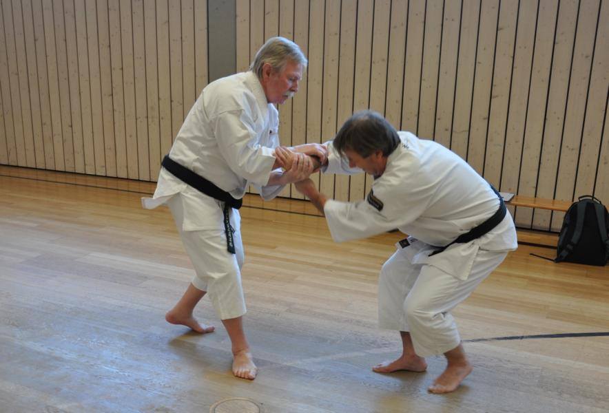 Zum Einstieg hatte Birling Sensei chudan gaeshi zu uchi uke zuki aus dem Kumi Embu vom 4. Dan ausgewählt. Diese Technikfolge kommt nur im Kumi-Embu vor und wird deshalb zwangsläufig auch nicht so oft geübt. Die Auffrischung dieser Technikfolge kam allen Seminar-Teilnehmern sehr gelegen. Weiter ging es mit okuri gassho konoha nage aus dem 5. Dan. Hier zeigte sich wieder einmal das herausragende Können und Wissen von Wunderle Sensei, dessen Juho-Fertigkeiten uns immer wieder verblüffen. Es ging weiter mit den schmerzhaften Hebeltechniken kubi jime nage und kiri gote morote. Speziell bei der morote Form von kiri gote beschäftigten wir uns intensiv mit dem unpoho bzw. tai sabaki, welches hier – wie so oft – das Fundament für das Funktionieren der Technik darstellt. Nur mit der richtigen Laufschule und den korrekten Drehungen können beide Hände des Verteidigers zusammenarbeiten und die Hände des Angreifers einklemmen bzw. kontrollieren (siehe Foto). Diese anspruchsvolle Technik befindet sich im Lehrprogramm für den 2. Kyu.
