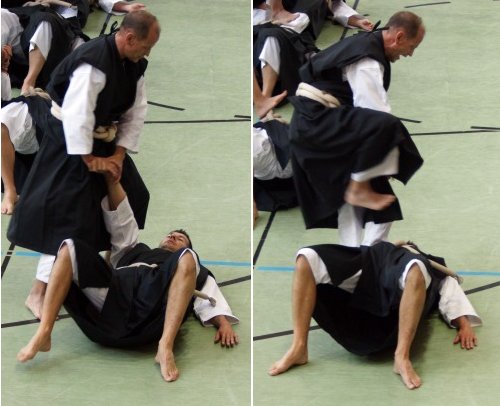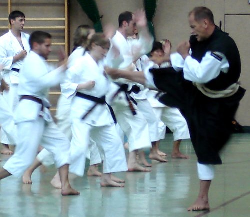 Kammerl-Sensei (5.Dan) und Birling-Seinsei (4.Dan) bei der Technik “ryu-sui-geri-mae”.